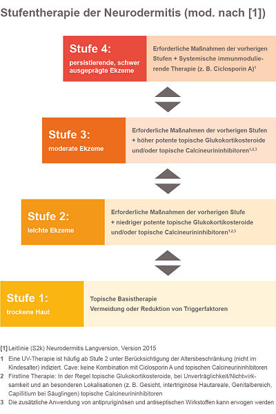 Bei Patienten mit trockener Haut (Stufe 1) sollen die betroffenen Stellen lokal behandelt werden, um den Juckreiz und die Entzündung zu bekämpfen. Auch ist es wichtig, die Auslöser der Neurodermitis, wie beispielsweise Allergene, so gut wie möglich zu meiden. Bei leichten Ekzemen (Stufe 2) können darüber hinaus antientzündlich wirkende Cremes aufgetragen werden, die als Wirkstoff entweder Kortison oder Pimecrolimus und Tacrolimus enthalten, sogenannte Calcineurininhibitoren. Calcineurininhibitoren sollten vor allem in sensiblen Hautbereichen, u.a. dem Gesicht, zum Einsatz kommen. So können kortisontypischen Nebenwirkungen, wie z. B. eine Hautverdünnung vermieden werden.